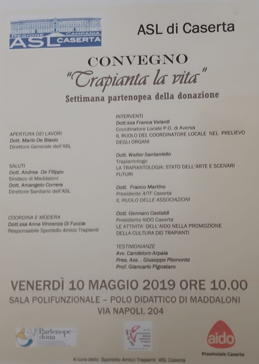Trapianta la vita By admin Posted 03/05/2019 In 0 Dettaglio eventi Data: 10/05/2019 10:00 – 17:00 Luogo: Maddaloni Categorie: Congressi, EVENTI, Partenope dona Recent Posts8° CORSO TPM CAMPANIA per coordinantori alla donazione ed al prelievo di organi e tessuti 7-9 Maggio 2024Ruolo dei regimi di condizionamento nella tossiticità del trapianto delle cellule staminaliDONAZIONE DEGLI ORGANI: MONTEFALCIONE E’ IL COMUNE PIU’ GENEROSO DELLA CAMPANIAGiornata di sensibilizzazione per la donazione di organi e tessuti (Azienda Dei Colli)